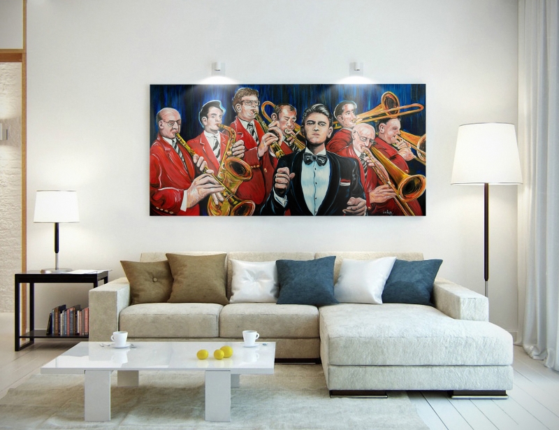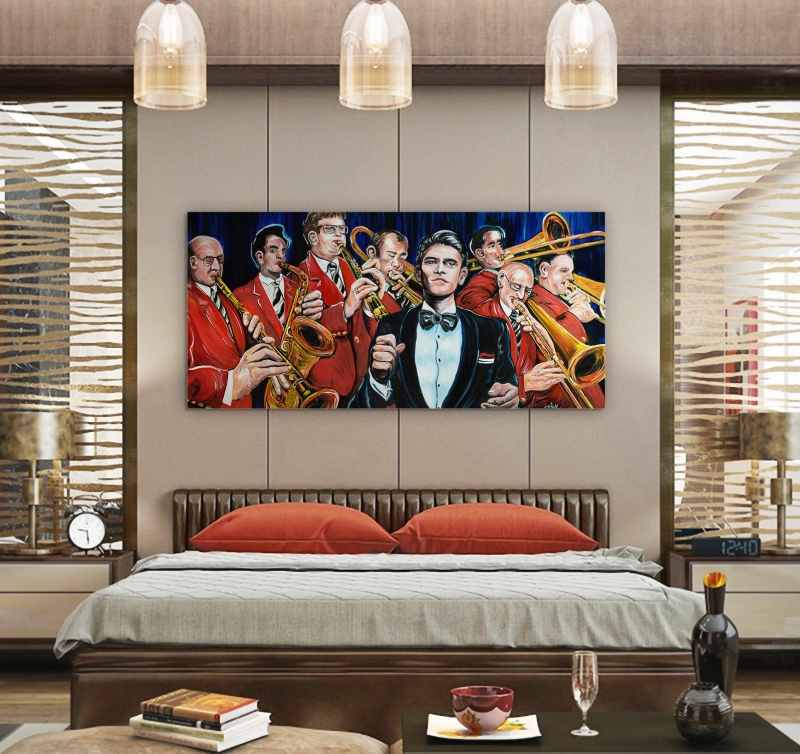 Big Band is based on the Glenn Miller touring Orchestra who came to town and played in a tiny coffee house venue so they were all crowded together on the small stage still succeeding at being grand performers.