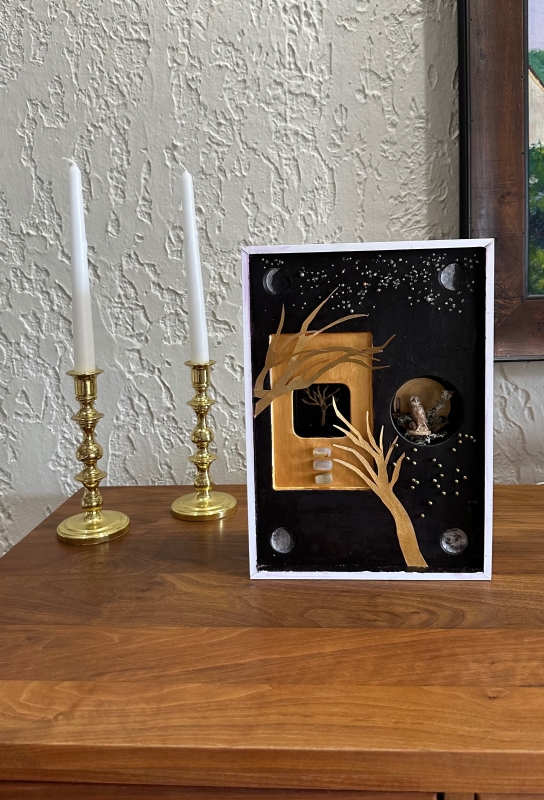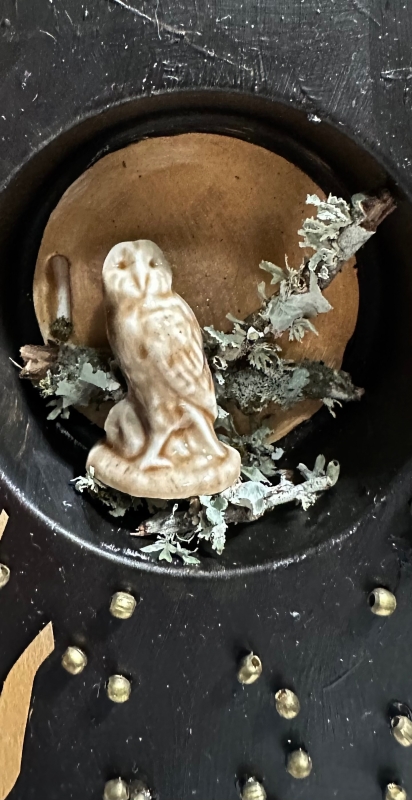 This sustainable art piece is created on an Apple product box with objects and materials already in my studio collection. The "Wade Whimsy" vintage owl is from my miniature collection, and his perch from my front yard. The stones and gold beads are sourced from a deconstructed necklace. The silver stars are straight pins dipped in paint and beads left over from Christmas stocking construction. Collage and assemblage are a satisfying way to use what's on hand--it's like a treasure hunt for just the right object.