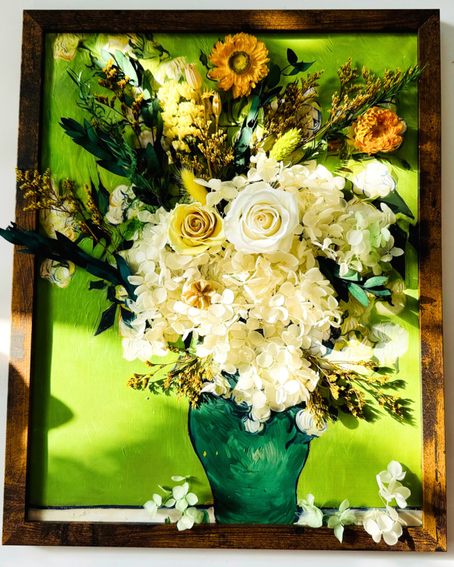 Created by Aileen, Owner of an Austin based Dried Flower Shop, 50 Shades Of Greed, our Van Gogh-Inspired Preserved Flower Art brings a fresh dimension to the iconic beauty of Van Gogh's flower paintings. By layering real preserved flowers onto famous works like "Sunflowers," we create a unique blend of classical art and natural beauty. Each piece captures Van Gogh’s vision with an added touch of texture and life, making it a stunning, one-of-a-kind addition to your decor. All flowers are real flowers that will last for years to come. These flowers are also called "Forever Flowers" that require no maintenance. Visit our store for more dried flower arts at www.50ShadesOfGreed.com