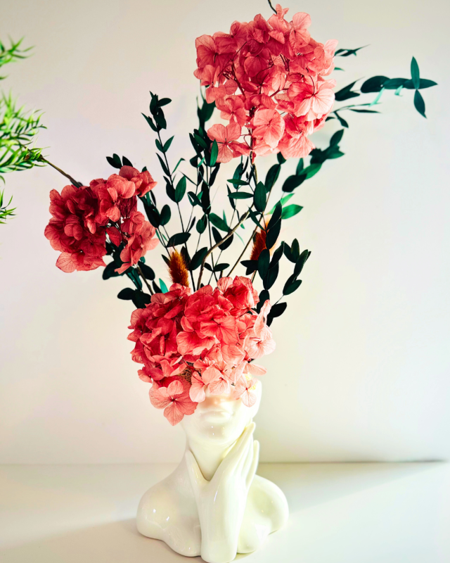 Created by Aileen, owner of dried flower store, 50 Shades Of Greed, "elegance in Bloom" features preserved flowers arranged in a ceramic vase shaped like a graceful lady with one hand touching her neck. This piece captures a sense of timeless elegance, combining the natural beauty of preserved blooms with the sophisticated, artistic form of the vase, making it a truly charming decor statement. These dried flowers are real flowers that will last for years to come. No water and no sunlight needed. Your go to floral art that requires no maintenance. Visit www.50ShadesOfGreed.com for more dried flower arts.