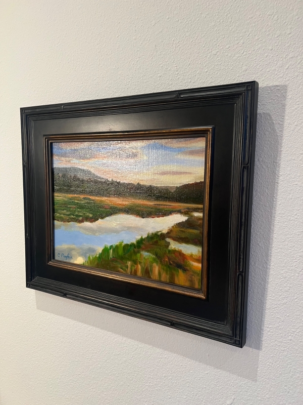 1.“Awakening”- Oil on birch panel with linen Panel 12” X 16”, frame 15.5” X 19.5” Painting of sunrise on the Golden Road just outside of Baxter State Park