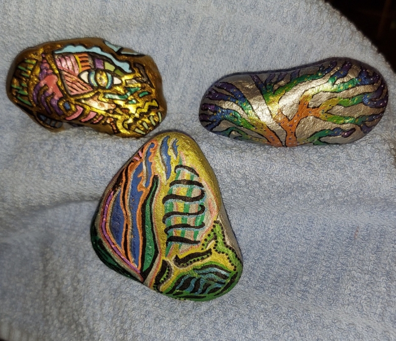 More than Meets the Eye Collection: Dual-sided, hand-painted acrylic on stone. Each stone has 2 sides and 2 stories. Price negotiable, range of $115-125