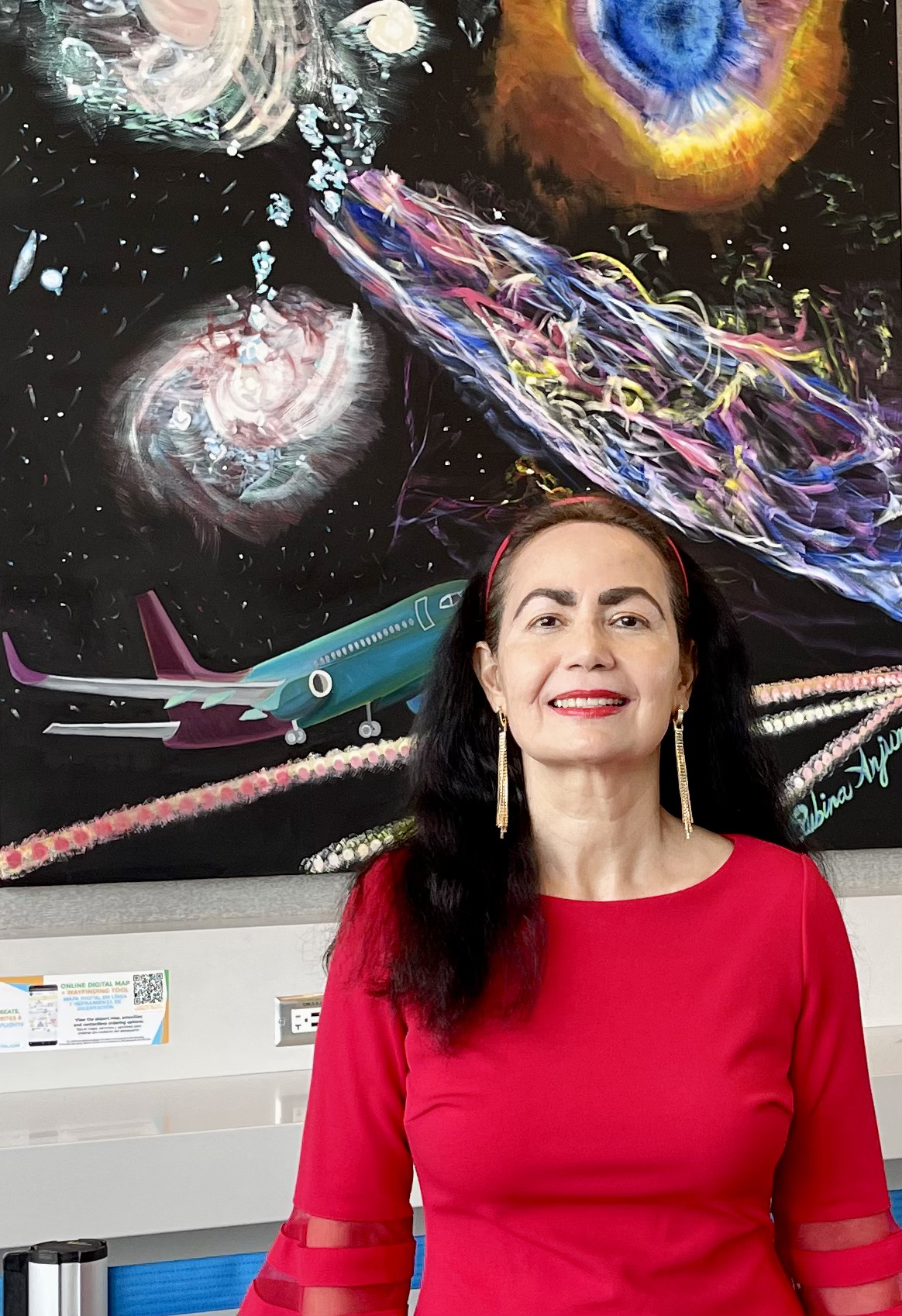 Rubina is the Inaugural Artist-in-Residence at Austin-Bergstrom International Airport. In her art studio at the Austin Airport. She created a three-part series called "From Austin Airport to the universe. These large-scale Oil on Canvas paintings were displayed at Gate 25 of the main Austin Airport terminal for a year. Through this series, she aimed to provide impetus for viewers to launch on a transformative, visual journey of tranquility and wonder, forging a connection between their immediate surroundings and the vast expanse of the universe. Through the Austin Airport’s Art Program, she shares artistic practice with travelers. Her art-making videos are airing 24/7 at checkpoint 2, near American Airlines; they fuse moments of beauty, contemplation, and inspiration into the journeys of diverse travelers.