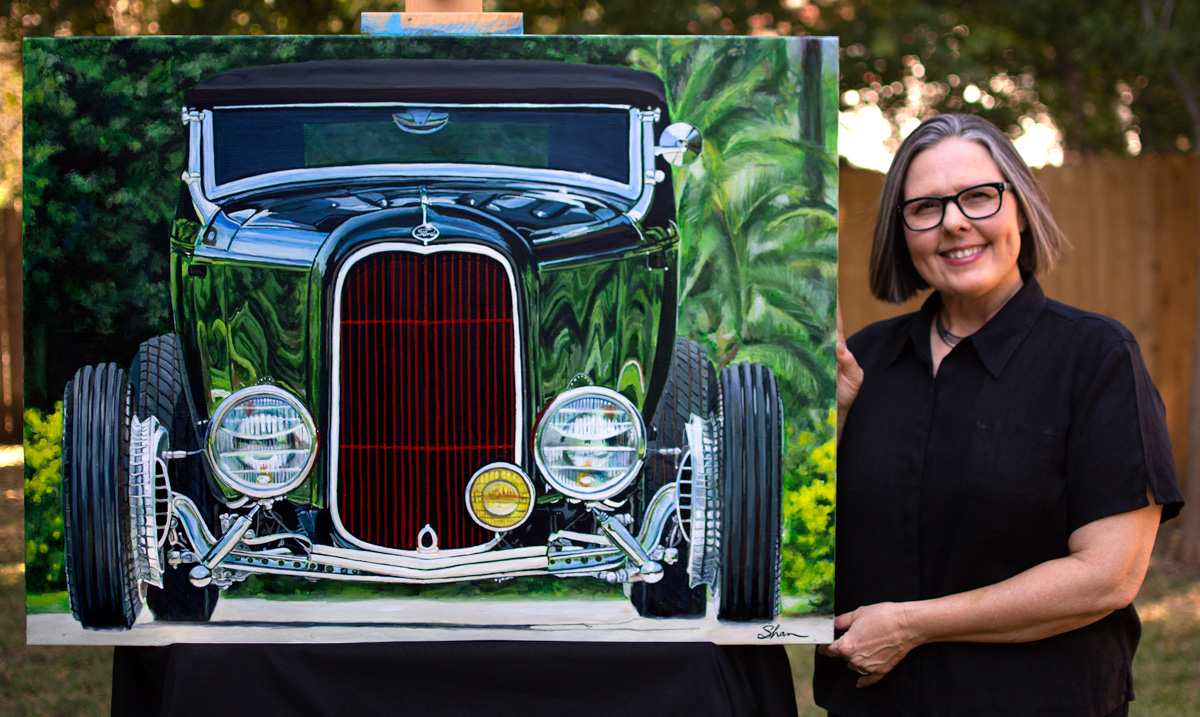 Born 1969 in California, artist Shannon “Shan” Fannin brings vehicles to life with a combination of photorealism and abstraction. Painting in a unique style using acrylics, hands, and brushes allows her to focus on the vehicle while giving a hint of the abstract surroundings. Fannin travels within the United States and internationally to photograph vehicles, and talk with their owners to enhance her creative process.